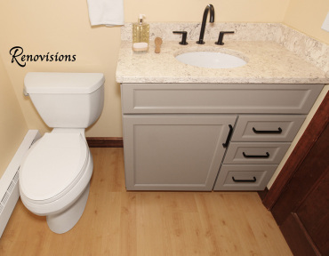 This half bath features a new all-wood vanity in a soft gray finish paired with a natural-looking quartz countertop in subtle gray and taupe tones.