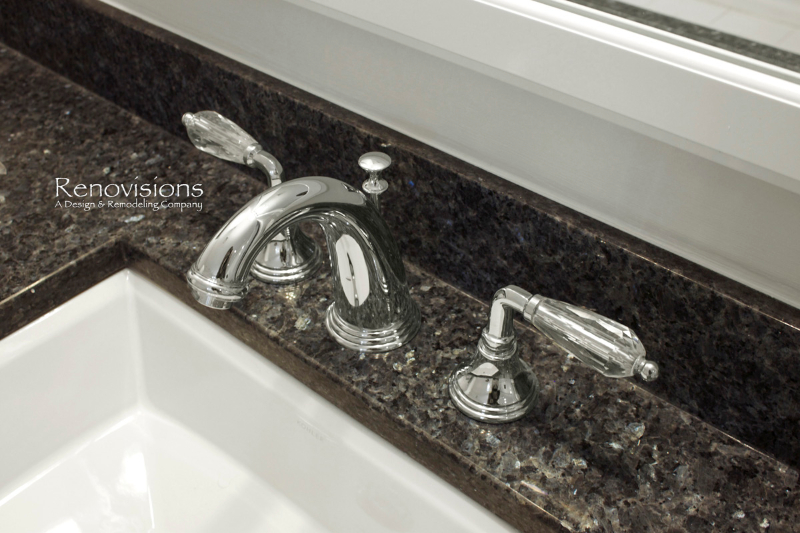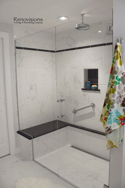 These homeowners envisioned a spa-like retreat with a large curb-less shower—and Renovisions delivered. Featuring multiple showerheads, including a ceiling-mounted rain shower, handheld on a slide bar, and a bench seat in Blue Pearl granite, this shower is designed for comfort, accessibility, and luxury.