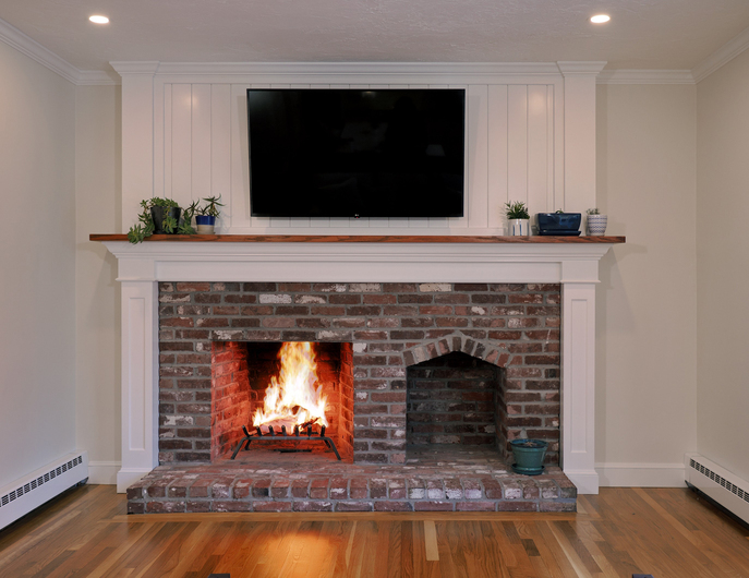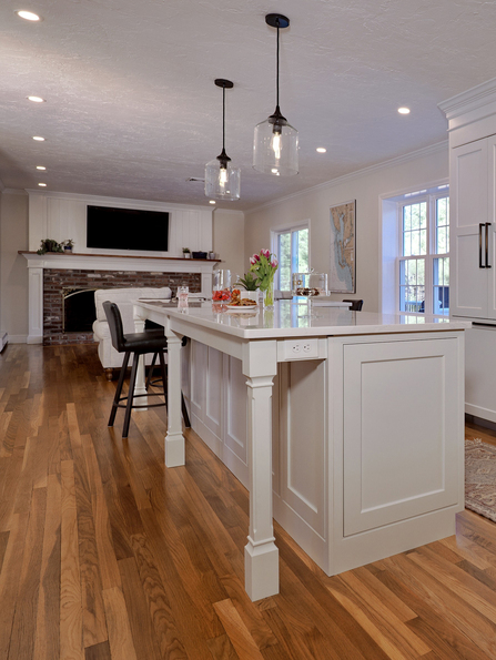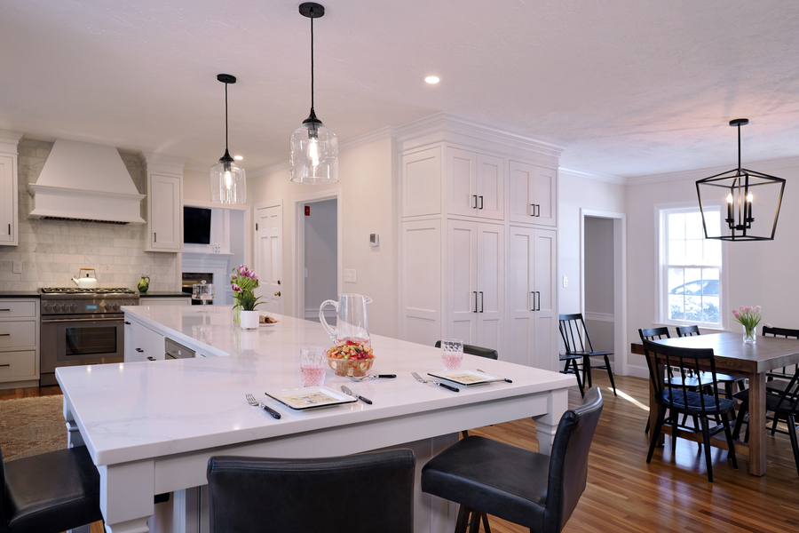 The centerpiece of the new space is an 11-foot island with furniture-style cabinetry and custom-turned legs, offering generous seating, ample storage, and room for meal prep, baking, crafts, and homework. The island, paired with tall pantry cabinets and two-tone quartz countertops, including a soapstone-look surface on the perimeter and a Calacutta gold-inspired finish on the island—creates a high-functioning, elegant work zone. A built-in bar with wine and beverage refrigeration enhances the space for entertaining, while Carrera marble tile backsplash, three-piece crown molding, and white beaded-inset cabinetry provide layers of timeless detail.